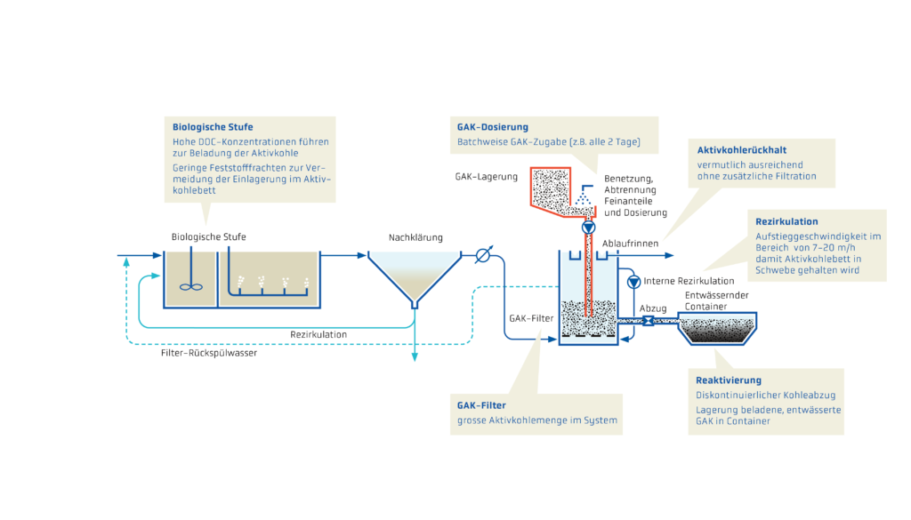 GAK im Schwebebett: Kenngrösse und Illustrationen Kenngrössen aus der Praxis KontaktreaktorGAK-Dosis2mg PAK/mg DOCBetthöhe (Ruhe / Expandiert)1.5 / 2.2mStandzeit80 – 100TageAK-Rückhalt> 97%Filtergeschwindigkeit7 – 15m/h Illustrationen