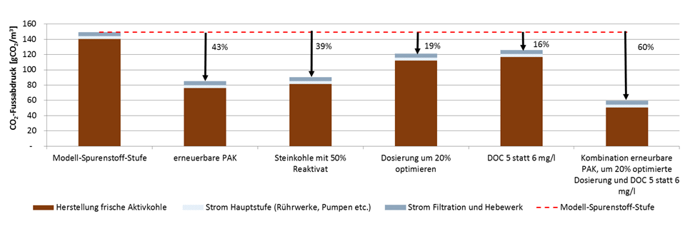 Bei PAK-Verfahren hat die Herstellung der Aktivkohle die grössten Umweltauswirkungen. Mit der Wahl einer Aktivkohle aus erneuerbaren Rohstoffen oder mit hohem Reaktivat-Anteil kann die Umweltauswirkung der Reinigungsstufe stark beeinflusst werden. Eine optimierte Dosiermenge hat ebenfalls einen grossen Einfluss. Dies erreichen Kläranlagen-Betreiber beispielsweise, wenn sie ein Aktivkohle-Produkt mit hoher Reinigungsleistung für ihr Abwasser einsetzen sowie bedarfsgerecht dosieren. Die Verringerung des Materialaufwands für die Infrastruktur hat eine untergeordnete Bedeutung.