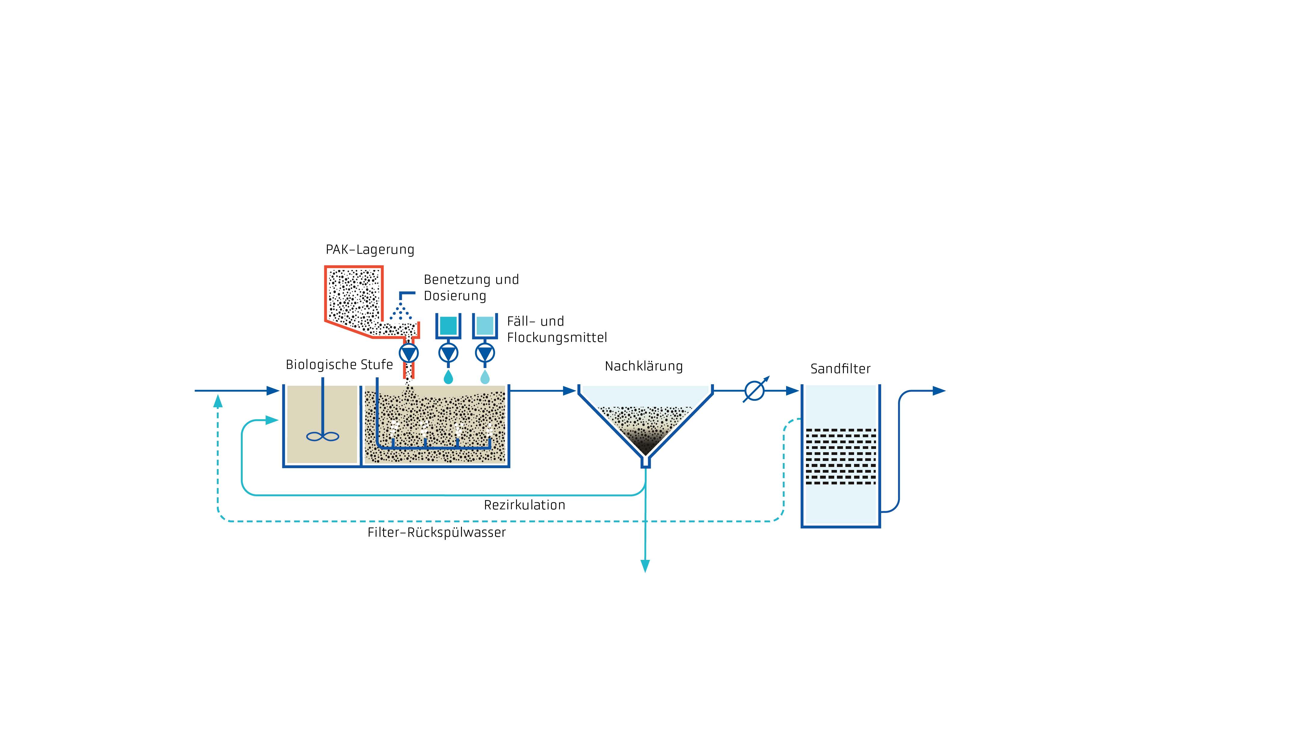 Bei der PAK-Dosierung vor den Sandfilter dient der Sandfilter sowohl als Adsorptions- als auch als PAK-Abtrennungsstufe. Bisher haben sich insbesondere (diskontinuierlich rückgespülte) 2-Schicht-Sandfilter bewährt, sowohl bezüglich PAK-Rückhalt als auch bezüglich Filterrückspülverhalten. Weiterführende Informationen zu den Abtrennverfahren sind hier verfügbar.