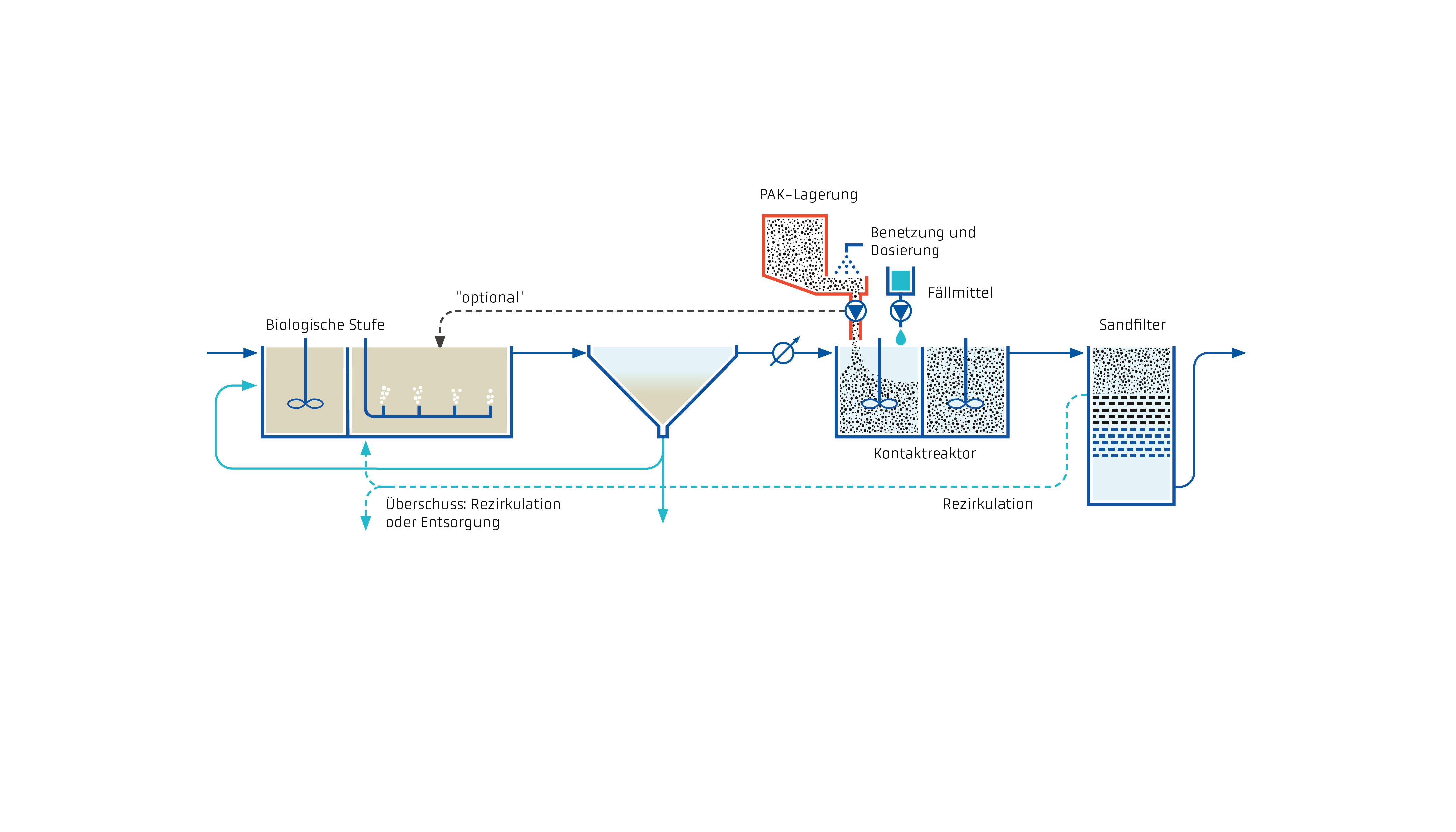 Bei nachgeschalteten Verfahren kann die PAK in die biologische Stufe zurückgeführt werden, um eine zusätzliche Beladung der Aktivkohle mit Mikroverunreinigungen zu erreichen. Dadurch wird auch eine gewisse Pufferwirkung erreicht, und der Schlammvolumenindex verbessert sich tendenziell. Es ist jedoch zu beachten, dass die Biologiebecken ausreichend gross sind, um die biologische Aktivität nicht negativ zu beeinflussen (ausreichendes aerobes Schlammalter), da je nach notwendiger PAK-Dosis, entsprechend mehr Klärschlamm produziert wird.
