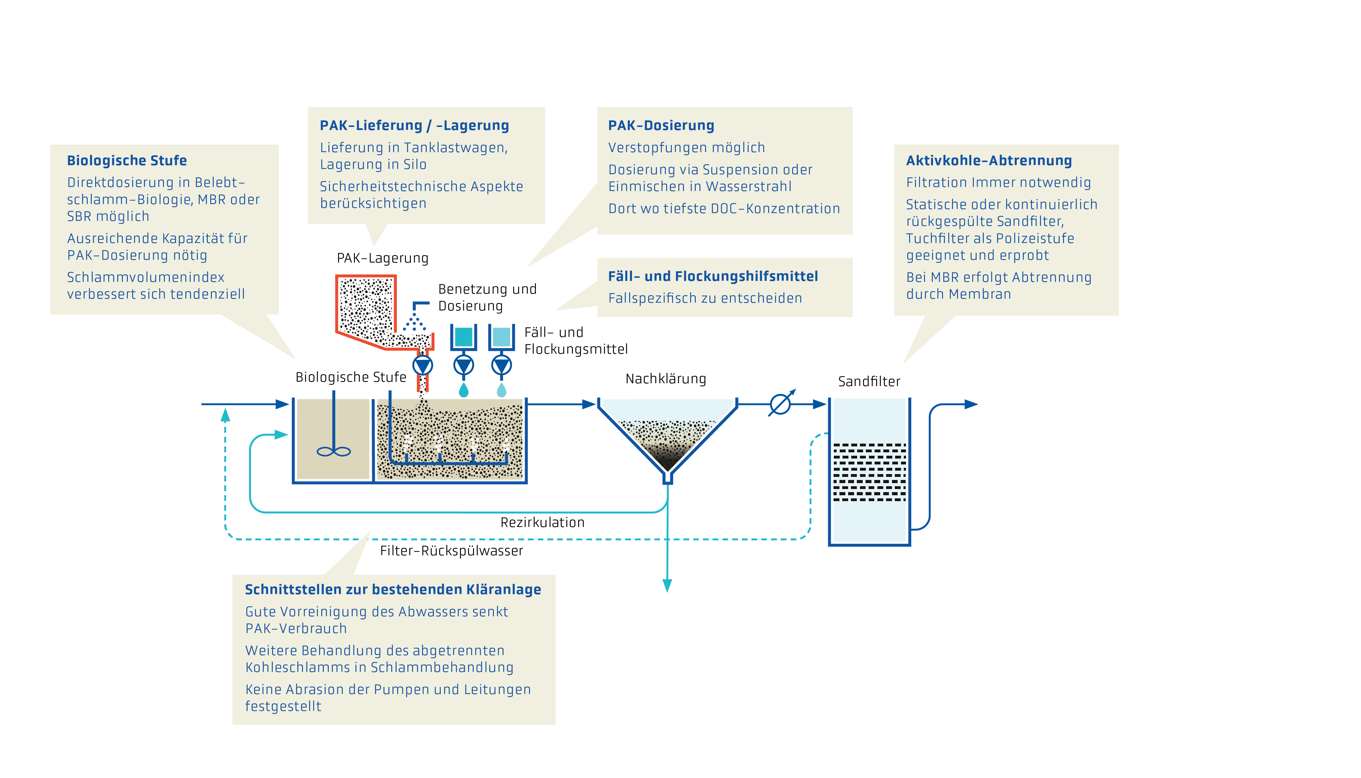 Bei der PAK-Dosierung in die biologische Reinigungsstufe wird die PAK im hinteren Bereich der Biologie dosiert, wo ein bedeutender Teil der organischen Stoffe bereits eliminiert wurde (geringere Konkurrenz von organischen Stoffen um die Bindungsstellen auf der Aktivkohle).