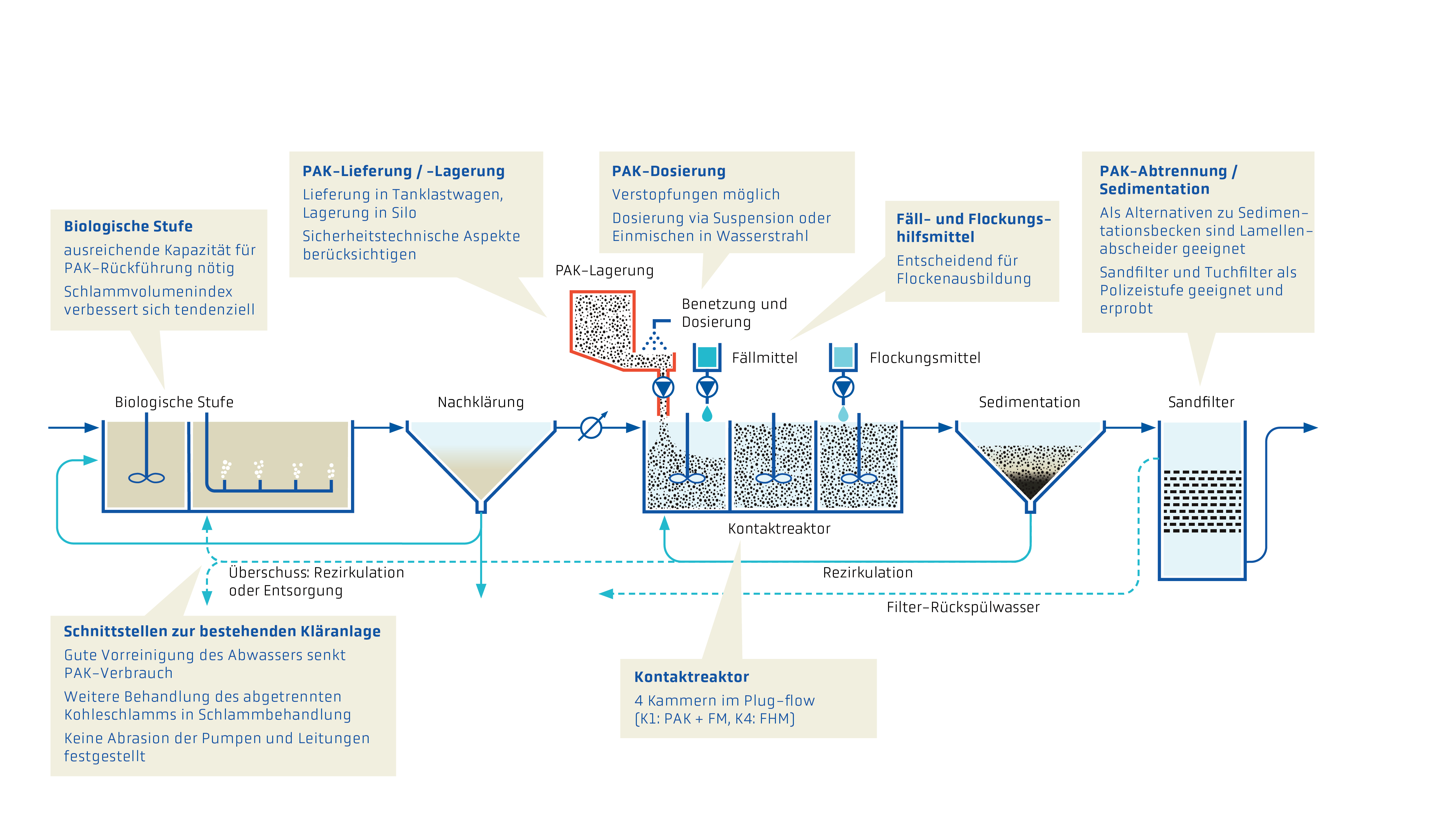 Die PAK wird der Schlammbehandlung gemeinsam mit dem Belebtschlamm zugeführt. Die Schlammbehandlung wird dadurch nicht negativ beeinflusst (bezogen auf die Entwässerbarkeit und den Heizwert). Auch findet keine signifikante Rücklösung der gebundenen Mikroverunreinigungen in der Faulung statt.